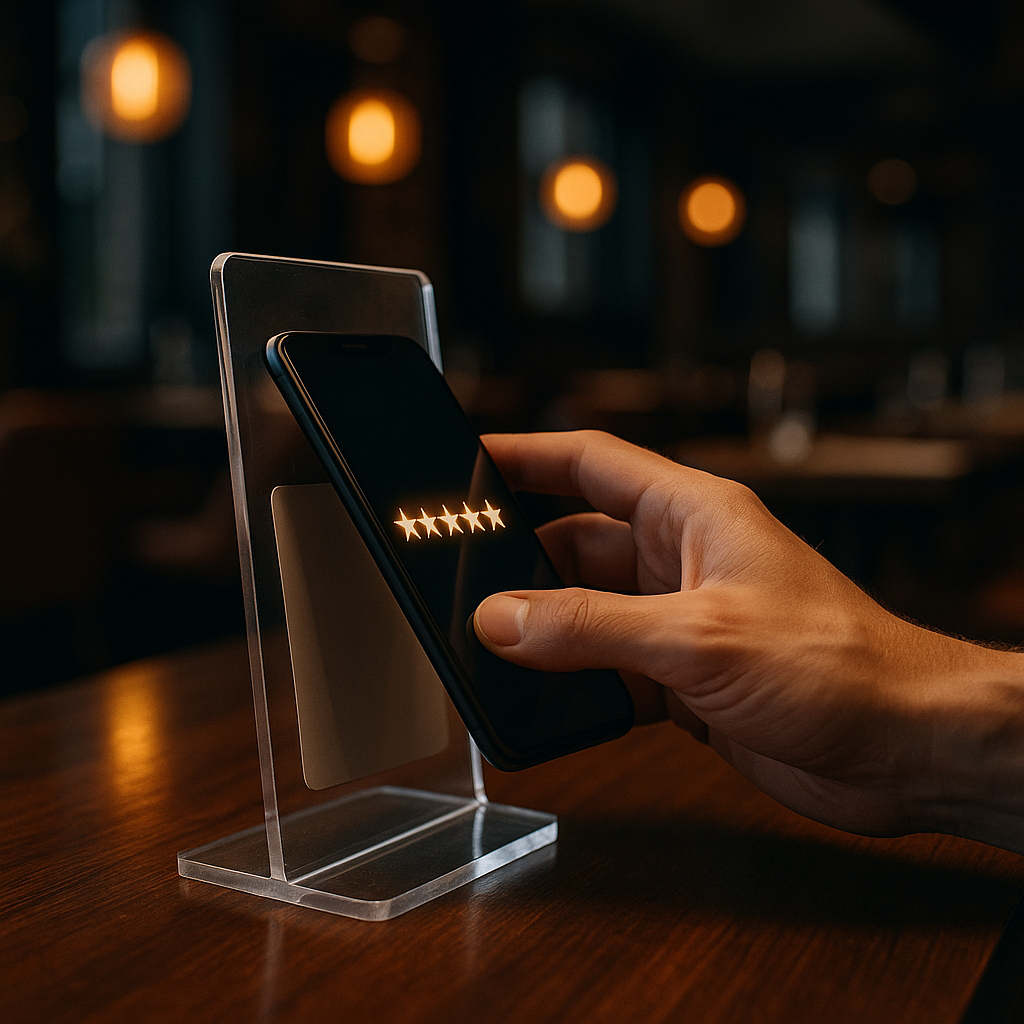 Place at your counter or checkout. Customers tap their phone — your Google review page opens instantly. Reviews flow on autopilot.